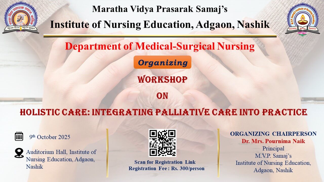 Under the guidance of Dr. Pournima Naik, Principal, the Department of Medical Surgical Nursing organized the workshop on “Holistic Care: Integrating Palliative Care into Practice.” The program was graced by Chief Guest Dr. Sudhir Bhamare, Dean of Dr. Vasantrao Pawar Medical College Hospital & Research Centre, Nashik. The sessions were conducted by resource persons with expert knowledge, and participants benefited from the speakers who came with specialized understanding of patient-centered care. All the speakers contributed with their expert knowledge, making the workshop informative and meaningful for students and faculty.