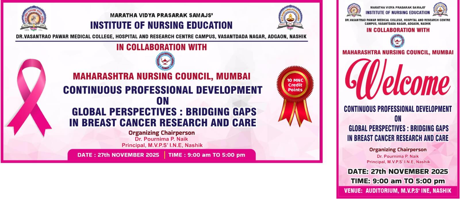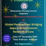 Maratha Vidya Prasarak Samaj’s Institute of Nursing Education, Adgaon, Nashik is pleased to announce a Continuous Professional Development (CPD) Programme organized in collaboration with the Maharashtra Nursing Council, Mumbai on the theme “Global Perspectives: Bridging Gaps in Breast Cancer Research & Care.”